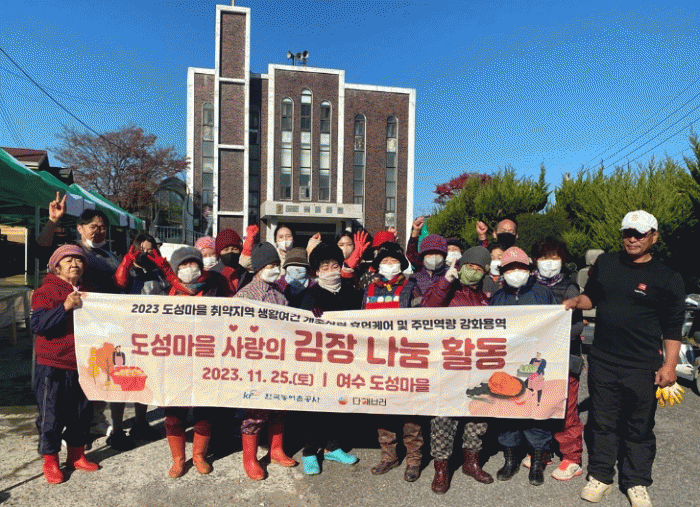 이날 도성마을 주민과 한국농어촌공사 순천광양여수지사, ㈜다해브러 등 총 50여명이 참여해 직접 700포기의 김장김치를 담가 도성마을에 거주하는 모든 주민 100여 가구에 전달했다.