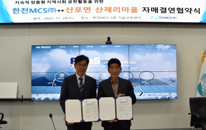 이재덕 산포면장도 “산제마을과 한전MCS(주)의 무궁한 발전을 기원한다”며 “자매결연을 계기로 도농 교류가 활성화 되길 기대한다”고 밝혔다.