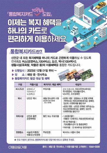 ‘행복더하기 통합복지카드’는 관내 거주하는 65세 이상 어르신, 장애인, 유공자, 기초생활수급자 등의 다양한 복지 대상자가 읍면사무소 방문 없이 분야별로 맞춤 복지 혜택을 신청하고 복지카드 발급과 카드 이용 및 조회까지 한 번에 제공되는 통합 복지 서비스이다.