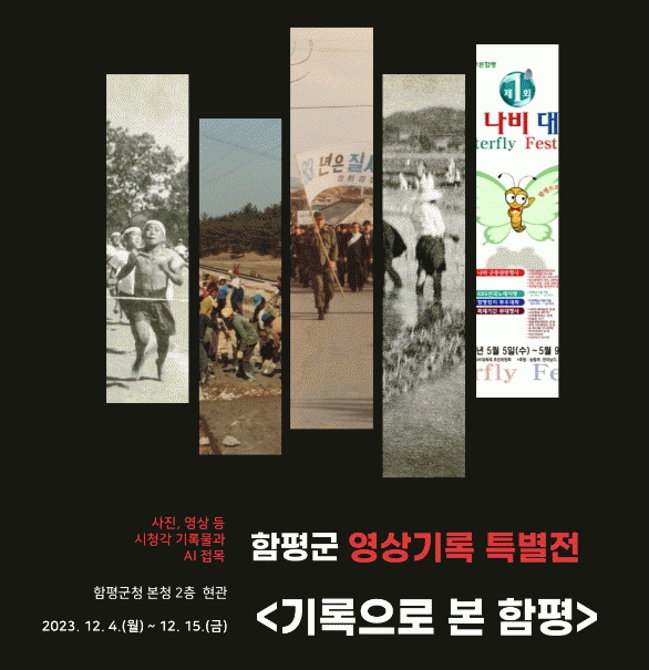 1일 함평군은 “오는 12월 4일부터 15일까지 함평군청 본청 2층 현관에서 축제, 민간기록, 행정기록 등 3가지 테마로 영상기록 특별전을 개최한다”고 밝혔다.