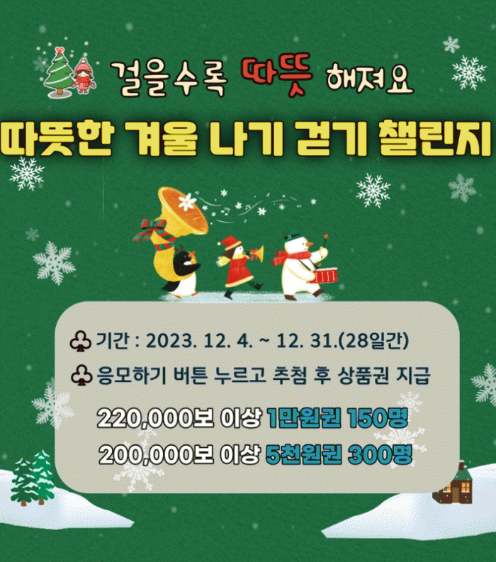 오는 4일부터 31일까지 진행되는 이번 걷기 챌린지는 1걸음 당 1마일리지 적립으로 1일 최대 8천 마일리지가 누적되며 목표 마일리지 달성 시 상품권 응모가 가능하다.