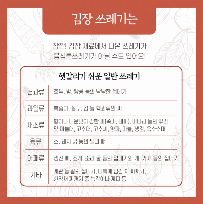 다만, 가능한 한 작게 썰어놓은 김장재료(배추나 무)와 절이거나 양념 과정에서 나온 양념, 젓갈류 등 이물질이 묻은 채소류 배출은 음식물류 폐기물 전용 수거 용기를 이용해야 한다.