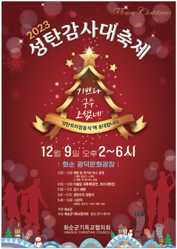 이날 2시부터 짧은 글짓기, 먹거리 부스를 운영하고 공연과 퀴즈문제풀이 행사에 이어 5시에는 사랑 실천의 문화를 확산하기 위해 화순기독교협의회 주최로 축하 예배와 공연, 성탄 트리 점등식 순으로 진행된다.