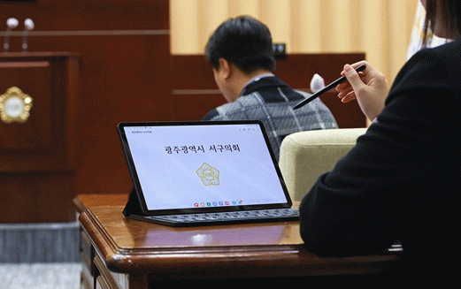 지난 11월 전의원 간담회를 통해 탄소중립 실천을 위하여, 솔선수범 하고자 회의 운영시 테블릿 PC를 이용한 종이 없는 회의를 실행 하고자 하는 의견을 모아 금번 본회의부터 실행하게 됐다.
