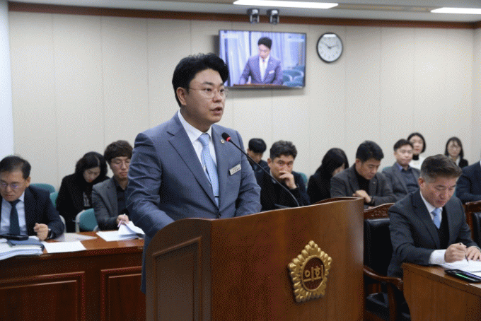 김호진 도의원이 기획행정위원회 회의에서 조례안에 대한 제안설명을 하고 있다.