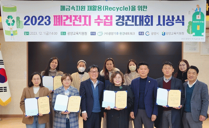경진대회 이후 학생 수 대비 폐건전지 수집량을 산정해 지난 1일 광양교육지원청에서 (사)전남광양기후환경네트워크, 광양학부모연합회 주관으로 시상식을 개최했다. 대회 결과, ▲최우수상은 중앙초 ▲우수상은 중마초, 백운초, 옥룡초 ▲장려상은 마동중, 칠성초, 제철남초가 수상했다.