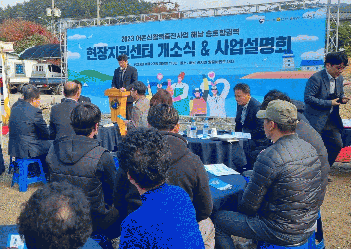 27일 열린 개소식은 송호항권역의 어촌신활력증진사업을 마을에 소개하는 공식적인 첫 자리로, 사업추진협의체 공동위원장인 서영준 해양수산과장과 송호마을 박미광 이장을 비롯한 지역주민과 유관기관 등 약 100여 명이 참석한 가운데 사업 설명과 추진경과를 보고하는 자리로 마련됐다.