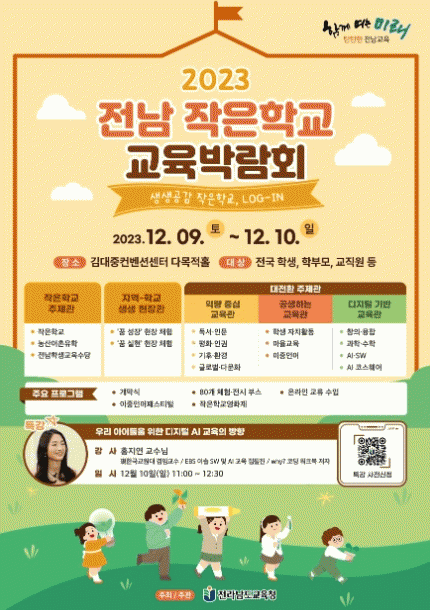또, 작은학교 주제관은 전남 작은학교, 전남농산어촌유학, 전남학생교육수당등 전남교육청이 추진하는 작은학교 주요 정책을 소개한다.