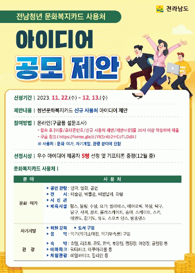 오종우 전남도 인구청년정책관은 “전남청년 문화복지카드 신규 사용처 아이디어 제안 공모에 많은 관심과 참여 바란다”며 “앞으로도 청년의 의견을 반영한 정책을 펼치도록 노력하겠다”고 말했다.
