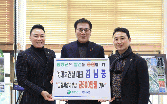 5일 군은 “㈜대호건설 김남중 대표가 함평의 발전을 위해 고향사랑기부금 최고 한도액인 500만원을 이날 기탁했다”고 밝혔다.