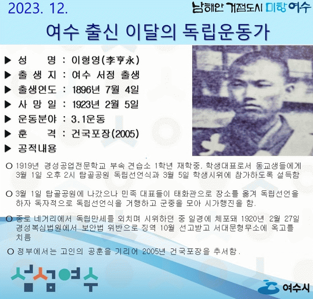 시 관계자는 “조국을 위해 희생하신 독립운동가들 덕분에 지금의 대한민국, 지금의 여수가 있다”며 “우리 지역 독립운동가를 잊지 않고 기억할 수 있도록 독립운동가 홍보에 더욱 힘쓰겠다”고 밝혔다.