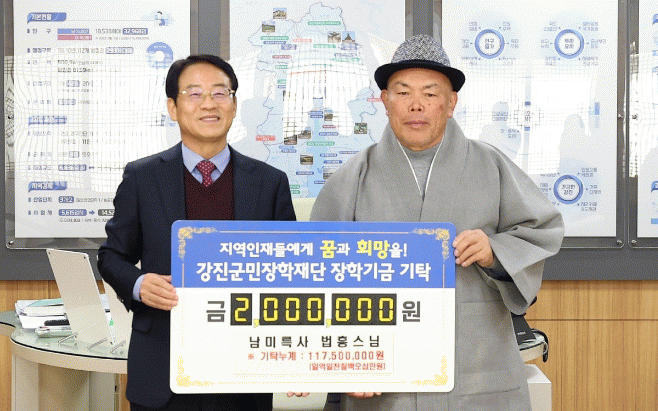 강진원 군수는 “항상 지역 교육 발전과 지역 학생들의 학업 정진에 관심을 가져주시는 법흥스님께 진심으로 감사드린다”며, “강진군을 위해 다양한 기부와 나눔 활동을 실천해주시는 선행에 보답할 수 있도록 최선을 다하겠다”고 밝혔다.