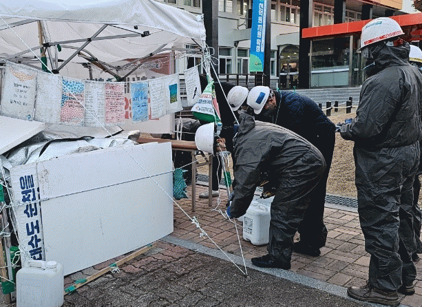 시 관계자는 “시청을 방문하는 시민들의 안전사고 우려 및 통행 불편 호소로 인해 더 이상 방치하고 묵과하기에는 어려웠다”며 “공공의 시설물과 부지에 대한 불법적인 점거로 시민의 안전 및 공공기관의 행정서비스 이용에 불편을 야기할 경우, 관련 법에 따라 엄정한 조치를 취하겠다”라고 밝혔다.