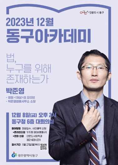 임택 동구청장은 “올해 마지막 동구 아카데미를 준비하며 주민들을 위해 어느 분을 초빙할까 많은 고민이 있었다”면서 “영화 같은 실화의 주인공 박준영 변호사를 통해 법과 인간 그 간격을 메우는 인문학적 성찰의 장에 주민 여러분의 많은 관심과 참여 바란다”고 말했다.