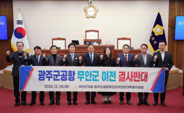 군의회는 5일 오후 1시 30분 의회 본회의장에서 기자회견을 열고 최근일고 있는 ‘전남도, 광주시, 무안군 간의 제3차 협의체 회담’논의를 즉각 중단하고 광주 군 공항 이전을 공모방식으로 전환할 것을 촉구했다.