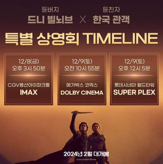이튿날인 12월 9일(토)에는 메가박스 코엑스 돌비 시네마, 롯데시네마 월드타워 수퍼플렉스에서도 드니 빌뇌브 감독 무대인사와 '듄' 상영회, '듄: 파트2' 푸티지 시사회를 진행한다.