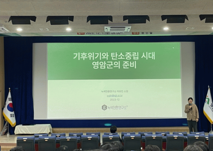 ‘2050탄소중립위원회’ 위원을 지낸 이유진 녹생환경연구소장은, 교육에서 ‘기후위기와 탄소중립 시대 영암군의 준비’를 주제로 강연했다.