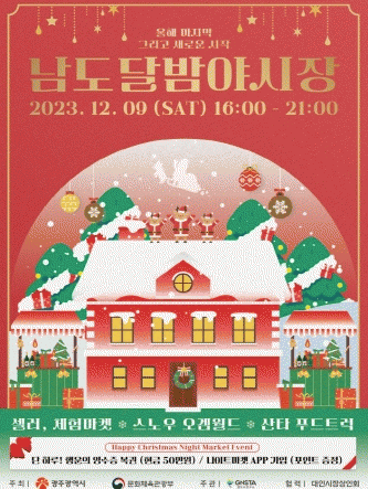 또한 기존 시즌에서 방문객들로부터 호평을 받았던 ‘오겜(오징어게임) 월드’, ‘귀장 체험존’도 올해 마지막으로 운영되고, 1만 원 이상 구매한 고객에 한해 ‘영수증 복권 이벤트’도 진행된다. 시장 점포 매출 증진을 위해 마련된 복권이벤트는 추첨을 통해 1등 50만 원, 스타벅스 커피 쿠폰 100장, 셀러 체험권 등 다양한 경품을 제공한다. 더불어 나이트마켓 앱 가입 인증 시 포인트 적립과 더불어 추첨을 통해 크리스마스 케이크를 증정하는 연말 이벤트도 함께 진행될 예정이다.