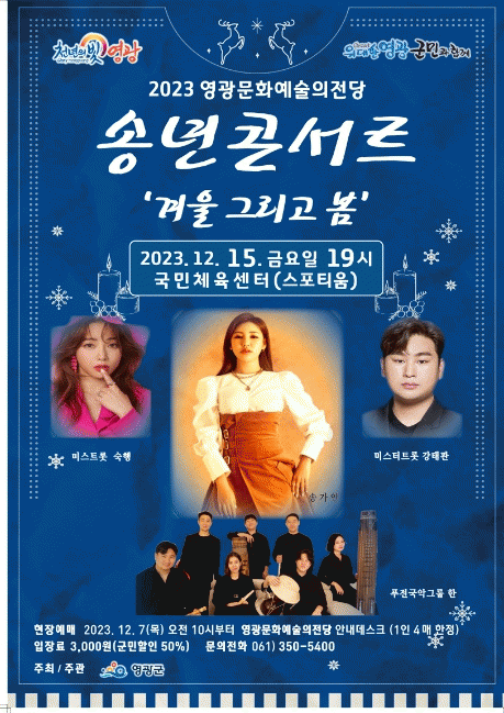 영광군은 매년 수준 높은 송년콘서트를 통해 군민 화합과 소통, 교류의 장을 마련하고 있으며, 남은 2023년 한해도 마무리를 잘하고 군민에게 따뜻한 위로와 함께 치유와 희망의 시간을 전하고자 공연을 준비했다.