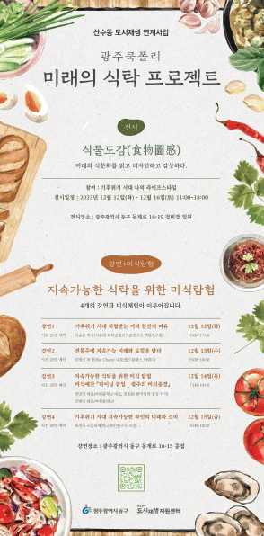 산수동 도시재생 연계사업 일환으로 마련된 이번 행사는 지속 가능한 미래의 식문화에 대한 전시·강연(미식탐험)을 통해 기후 위기의 시대적 흐름을 이해하고, 가치를 정립하는 담론의 장으로 진행될 예정이다.