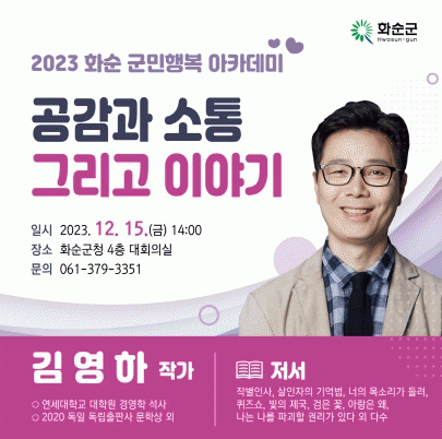 화순군 관계자는“공감과 소통이 중요해지는 시대에 이야기가 주는 힘에 대해 이해하고 인문학 교양을 쌓을 기회를 마련하였으니, 군민들의 많은 관심과 참여를 바란다”라고 말했다.