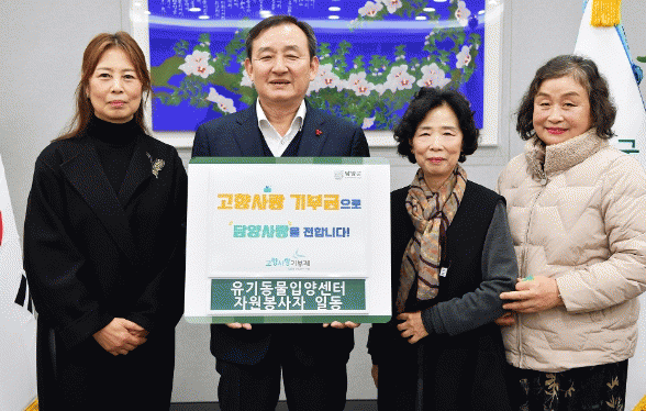 기탁식에는 이병노 담양군수, 자원봉사자 회원 등 6명이 참석했으며, 이날 자원봉사자들은 답례품으로 겨울철 입양센터 유기 동물을 위한 반려동물 간식을 선택해 훈훈함을 더했다.