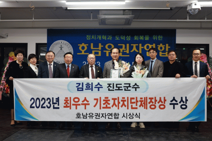 ‘호남유권자연합 2023 시상식 및 송년회’ 행사에서 최우수 자치단체장상을 수상한 김희수 진도군수는 ‘군민이 주인! 살기좋은 진도’를 만들기 위해 역동적이고 건설적인 군정을 추진하고 있다.