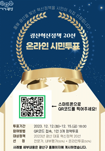 광산구는 이번 온라인 시민 투표(50%)와 전문가 및 내부직원 평가(50%)를 합산해 혁신 정책 순위를 가린다. 가장 높은 점수를 얻은 정책은 ‘혁신 대상’의 영예를 얻는다. 시상은 연말 종무식에서 할 예정이다.