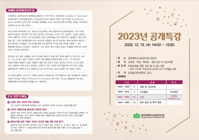 광주교육연수원 채경숙 원장은 “자녀교육에 고민이 많은 학부모들에게 저명한 심리학자인 김경일 교수의 특강이 많은 도움이 되길 기대한다”며 “우리 연수원은 앞으로도 시대에 발맞춘 다양한 연수를 통해 교육가족들의 미래교육에 앞장설 수 있도록 꾸준히 노력하겠다”고 밝혔다.