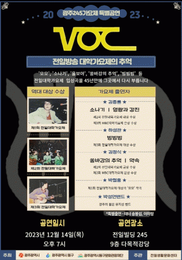 이번 공연에서는 전일방송 대학가요제 1회 대상 수상에 빛나는 ‘모모’의 작곡가 박철홍 씨, 2회 대상인 ‘소나기’는 임을 위한 행진곡의 작곡가로 유명한 김종률 씨, 3회 대상 수상곡인 ‘빙빙빙’은 가수 하성관 씨가 각각 출연한다.