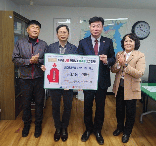 금호티앤엘 김군태 상무는 “앞으로도 지역 내 어려운 이웃을 위해 임직원의 끝전 모으기 활동을 지속적으로 이어갈 것”이라며 “지역사회와 지역민과 동행하는 기업이 되겠다”고 밝혔다.