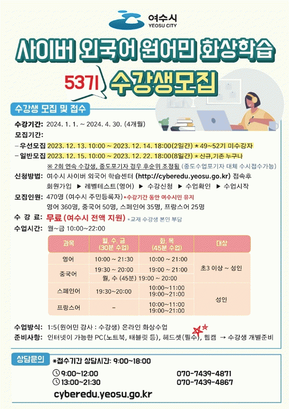 53기 원어민 화상학습은 2024년 1월 1일부터 4월 30일까지 영어, 중국어, 스페인어, 프랑스어 등 4개 외국어로 운영되며 수강료는 무료다.