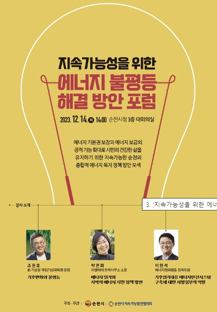 이번 포럼은 에너지 전환과 소득 불균형 심화로 인한 에너지 빈곤의 고통을 직면한 상황에서, 에너지 기본권 보장과 에너지 보급의 공적 기능 확대로 지속가능한 순천의 종합적 에너지 복지 정책 방안을 모색하기 위해 마련됐다.