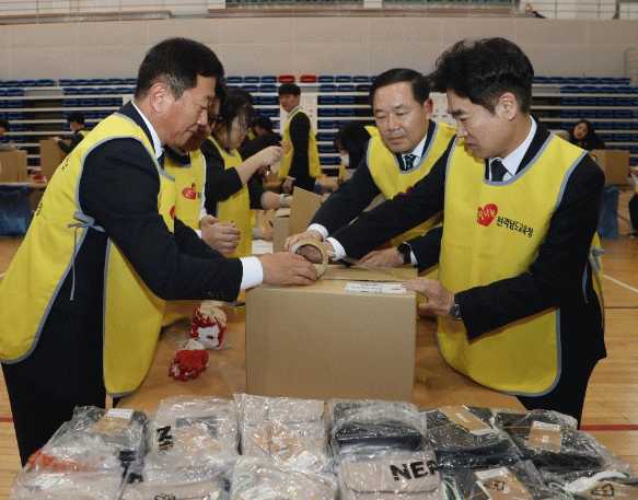 도교육청은 수혜 학생들이 선호하는 플리스 재킷과 실생활에 도움이 되는 크로스백 등의 생활용품을 선물로 준비해 이날 김대중 교육감을 비롯한 간부들이 참석한 가운데 정성들여 포장했다.