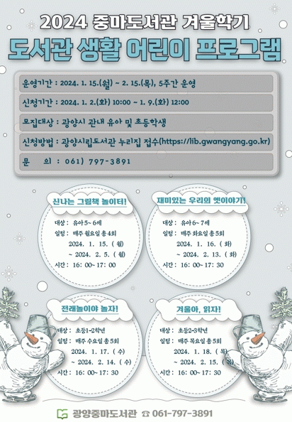중마도서관 프로그램 담당자는 “지역 어린이들이 2024 겨울학기 도서관 생활 어린이 프로그램에 참여해 배움의 기쁨을 경험하면서 창의력과 잠재력을 개발하고 꿈과 희망을 마음껏 펼칠 수 있도록 다양한 독서문화 프로그램을 운영할 계획이다”며 “도서관에서 마련한 강좌에 많은 관심과 참여를 바란다”고 말했다.