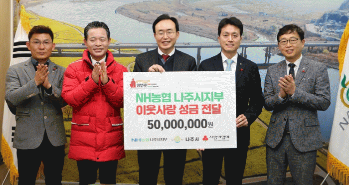 윤병태 시장은 “매년 지역사회 어려운 이웃을 위한 온정의 손길로 감동을 주시는 농협나주시지부 신경훈 지부장과 임직원분들께 감사드린다”며 “관심과 지원이 절실한 이웃들에게 따뜻한 마음이 잘 전달될 수 있도록 소중한 복지재원으로 사용하겠다”고 말했다.