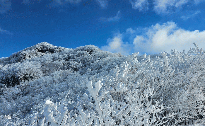 특히, 파란 겨울 하늘을 배경으로 앙상한 겨울 나뭇가지에 눈꽃처럼 피어나는 상고대는 보는 이의 탄성을 자아낸다.