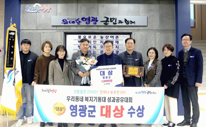 특히, 올해에는 영광군 특수시책인 저장강박 의심가구 주거환경개선사업과 연계하여 11가구에 주거환경개선, 전문가 상담, 사례관리지원으로 맞춤형 통합서비스를 제공했을 뿐만 아니라, 복지기동대를 통해 복지위기가구 1,517세대를 발굴하고, 발굴된 가구 안부 살핌, 소규모 주거환경 개선·청소 등 수요자가 원하는 생활밀착형 복지서비스를 원스톱으로 제공하여 취약계층의 생활문제 해소를 위한 다양한 노력과 성과를 인정받아 이번 성과공유대회에서 대상 수상과 함께 포상금 1,000만 원을 전달받았다.