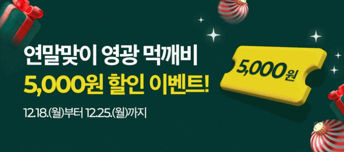 이벤트 기간에 먹깨비에서 1만 5천 원 이상 주문하면 5천원 할인쿠폰이 제공된다. 한 사람당 기간 중 2회 혜택을 받을 수 있고, 가맹점에서 발행한 자체 할인쿠폰이 있는 경우 중복하여 추가 할인이 가능하다. 할인 쿠폰은 예산 소진 시까지 발행되기 때문에 기간 내 조기 종료될 수도 있다.