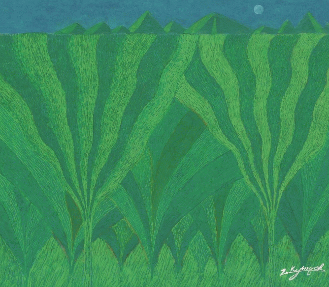 전시작 대부분은 녹색을 활용한 작품들로, 이 작가는 이를 통해 자연과 삶의 조화 및 균형을 생명력 있게 표현하고자 했다.