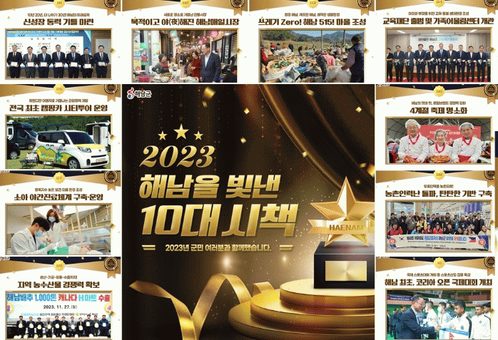 10대성과는 ▷솔라시도 기업도시 활성화 등 신성장 동력 기틀 마련 ▷해남매일시장 재개장 및 야시장 운영통한 전통시장 활성화 ▷주민주도형 마을 환경정화캠페인 ‘쓰레기 제로! 해남515!’ ▷해남군 교육재단 출범 및 가족어울림센터 개관 ▷전국 최초 캠핑카 시티투어 운영 ▷해남의 맛과 멋, 4계절 축제 명소화 ▷소아청소년 야간진료체계 구축 운영 ▷농촌 인력난 해소 다양한 일자리사업 추진 ▷수출확대를 통한 지역 농수산물 경쟁력 확보 ▷해남최초 국제 스포츠대회 개최 등 스포츠마케팅 활기 등이다.