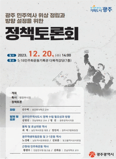 주제 발제와 토론은 ▲김병인 전남대학교 교수·명진 광주광역시의원의 ‘광주민주역사도시 정책수립 필요성과 방향’ ▲최혁 남도역사포럼 대표·정인서 광주서구문화원장의 ‘동학 및 호남의병 역사’ ▲노성태 남도역사문화원장·김보름 빛고을역사교사모임 대표의 ‘광주학생독립운동 및 3·1운동 역사’ ▲황광우 5?18민주화운동 작가·김희송 전남대학교 교수의 ‘광주학생독립운동 및 3.1운동 역사’ 등이 진행된다.