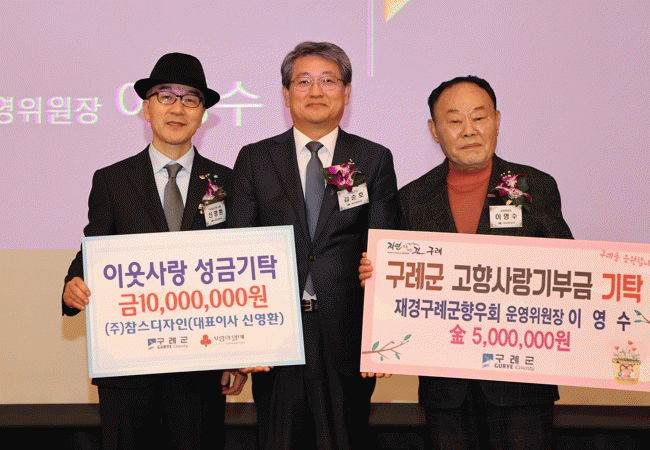 기부에 참여한 인사는 재경구례군향우회 이영수 운영위원장과 ㈜참스디자인 신영환 대표이사로 고향사랑기부금 최고액인 500만 원과 이웃돕기 성금 1,000만 원을 기탁했다.