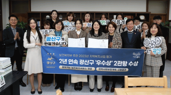 광산구는 지난해 2개 분야에서 우수상을 받은 데 이어 올해도 찾아가는 보건복지서비스 제공, 지역사회보장계획 시행 결과 2개 분야 우수지자체로 선정되며 2년 연속 우수상의 쾌거를 달성했다.