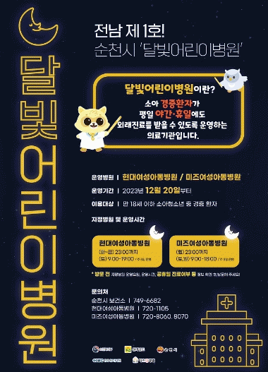 시 관계자는 “달빛어린이병원 운영으로 야간이나 휴일에 자녀가 아프면 소아과 전문의에게 신속하게 외래 진료를 받을 수 있게 됐다”며 “앞으로 소아 의료뿐만 아니라 응급의료 사각지대 해소에 모든 행정력을 집중하겠다”라고 말했다.