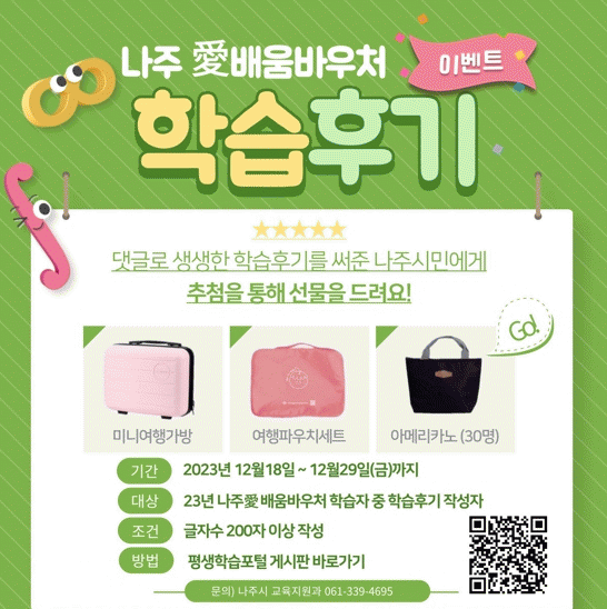 학습 후기 이벤트는 새롭게 시행된 나주愛배움바우처 사업 성과 분석과 내년도 사업 만족도 향상을 위한 학습 참여자 의견을 진솔하게 수렴하고자 마련됐다.