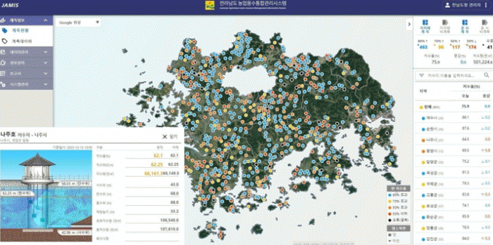 시스템에선 도내 3천208개소 농업용 저수지 중 수위 측정장치가 설치된 903개소 저수지의 수위를 10분 단위로 확인할 수 있다. 또 저수지 소재지별 강우량, 농업용수를 공급하는 영산강 수계 주요 지점별 수위도 실시간 확인 가능하다. 저수지의 수위가 급변할 경우 시설물 관리자에게 문자메시지가 발송돼 상황 발생에 따라 즉각적인 대처도 가능할 것으로 기대된다.