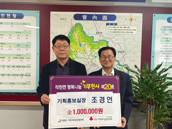 조경언 기획홍보실장은 “적은 금액이지만 우리 주변의 어려운 이웃들이 조금이나마 따뜻하게 연말연시를 보내길 바라는 마음으로 성금을 기탁했다”며 “작천면에 언제나 희망과 온정이 함께하길 바란다”고 말했다.