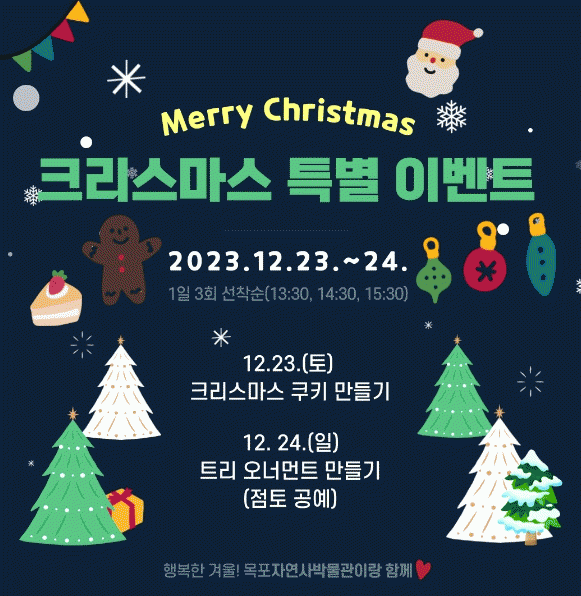목포자연사박물관은 즐거운 크리스마스 추억을 남길 수 있도록 다양한 색의 장식펜을 이용한 크리스마스 쿠키 만들기 체험을 진행하고, 점토 공예 체험인 트리 장식 만들기 이벤트를 운영한다.