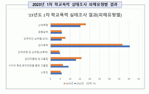 2023년 1차 학교폭력 실태조사 결과 전체 학교폭력 피해응답율은 1.9%로, 지난해보다 0.3%p 증가해 전국 피해 응답률과 동일한 것으로 나타났다. 학교급별 학교폭력 피해응답율은 지난해보다 초등학교는 0.5%p, 중학교는 0.5%p, 고등학교는 0.1%p 증가했다.
